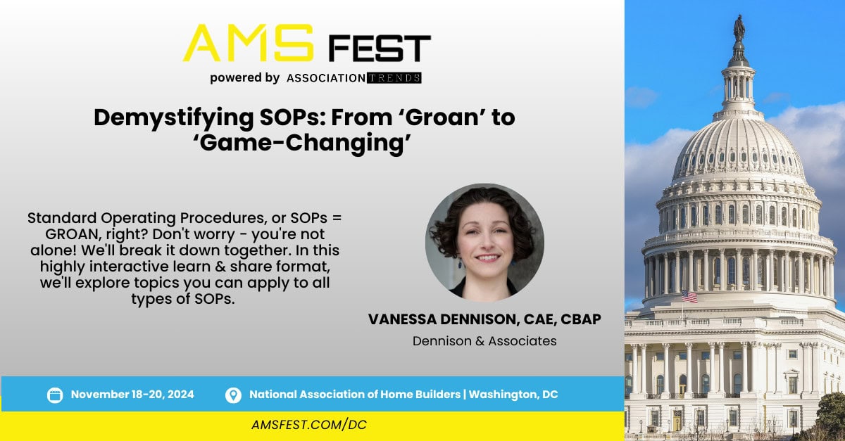 MS Fest in Washington, DC, powered by Association Trends—a prime event for associations focused on technology and management system advancements. This year, Dennison & Associates will be there, and Vanessa Dennison will lead an engaging session, “Demystifying SOPs: From ‘Groan’ To ‘Game-Changing’.” This session will guide you through transforming standard operating procedures (SOPs) into practical tools that drive efficiency and elevate member service. Join us to connect, learn, and discover tools and strategies to streamline your association’s tech and operations.
